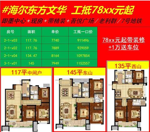 3室/92萬/117平米/海爾東方文華新房工抵套三雙衛(wèi)多套房子可選