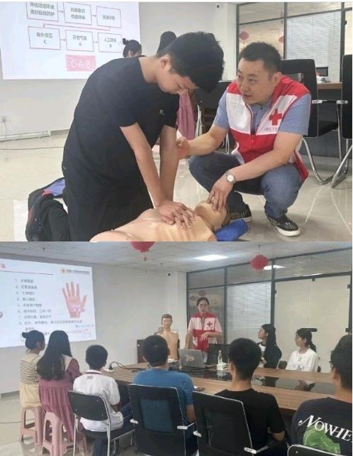 在理論講解環(huán)節(jié),紅十字會的老師憑借豐富的專業(yè)知識和教學經(jīng)驗,用簡潔明了的語言系統(tǒng)講解了應急救護的基礎知識。從如何快速判斷現(xiàn)場環(huán)境安全性、識別傷者意識與呼吸狀態(tài),再到進行胸外按壓和人工呼吸,每一個步驟都講解得清晰透徹,并結合實際案例,讓同學們直觀感受到“黃金急救時間”的重要性,深刻理解掌握急救技能的必要性。