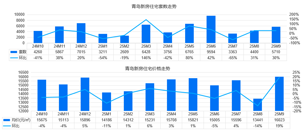 近日,青島樓市9月份成交數(shù)據(jù)陸續(xù)出爐。根據(jù)青島網(wǎng)上房地產(chǎn)公布的數(shù)據(jù)和貝殼研究院統(tǒng)計,9月,青島市全市新房(包括住宅、公寓、商業(yè)、辦公等)8048套,環(huán)比上漲46.1%。其中,商品住宅成交5710套,環(huán)比漲30%;成交均價16023元/㎡,環(huán)比漲19%。