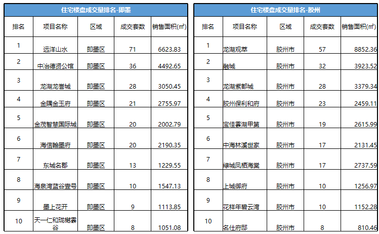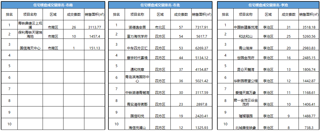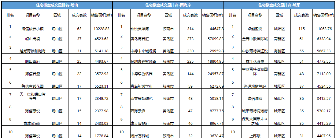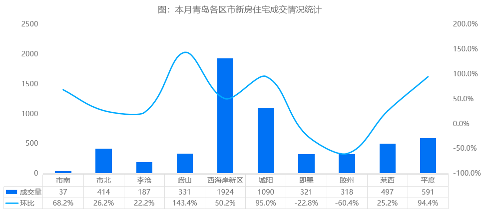 從新建住宅成交的區(qū)市數(shù)據(jù)來看,西海岸新區(qū)1924套、城陽區(qū)1090套、平度市591套位列新房住宅成交量位居前三。成交數(shù)量最少的是市南區(qū),僅有37套。